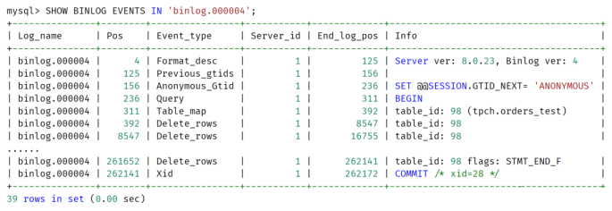 - 可以通过命令 SHOW BINLOG EVENTS IN ... FROM ... 查看二进制日志的基本信息;