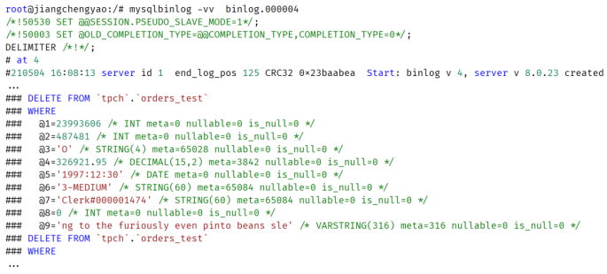 通过 MySQL 数据库自带的命令 mysqlbinlog,可以解析二进制日志,观察到更为详细的每条记录的信息,比如: