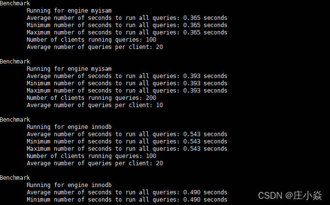 上述命令测试说明:模拟测试两次读写并发,第一次100,第二次200,自动生成SQL脚本,测试表包含20个init字段,30个char字段,每次执行2000查询请求。测试引擎分别是myisam,innodb。(上述选项中有很多都是默认值,可以省略,如果想要了解各个选项的解释,可以使用mysqlslap --help进行查询)。