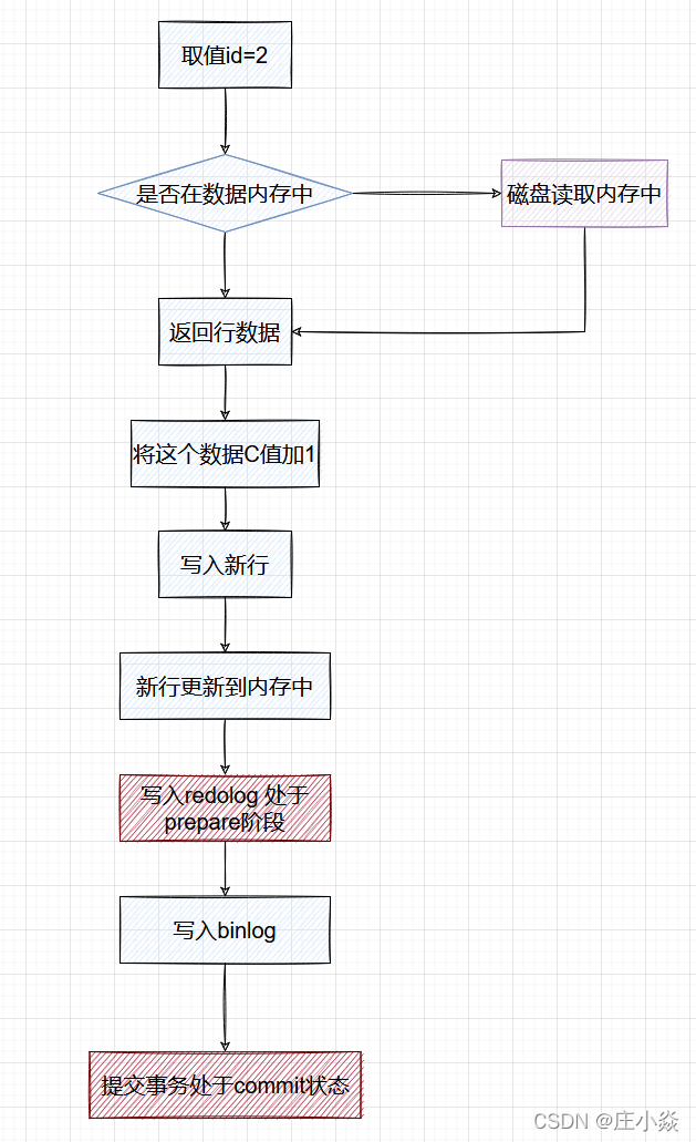 - 引擎将这行新数据更新到内存中,同时将这个更新操作记录到 redo log 里面,此时 redo log 处于 prepare 状态。然后告知执行器执行完成了,随时可以提交事务。