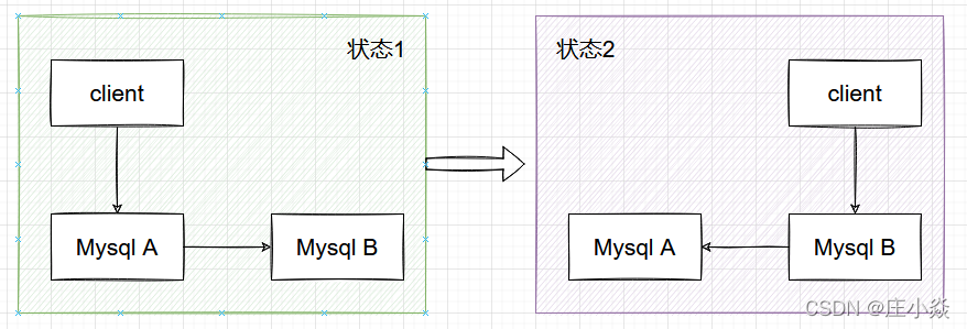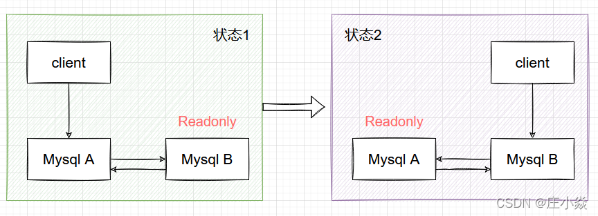 在状态 1 中,客户端的读写都直接访问节点 A,而节点 B 是 A 的备库,只是将 A 的更新都同步过来,到本地执行。这样可以保持节点 B 和 A 的数据是相同的。当需要切换的时候,就切成状态 2。这时候客户端读写访问的都是节点 B,而节点 A 是 B 的备库。