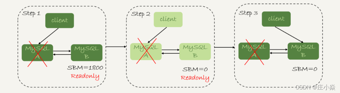 - 把主库 A 改成只读状态,即把 readonly 设置为 true;