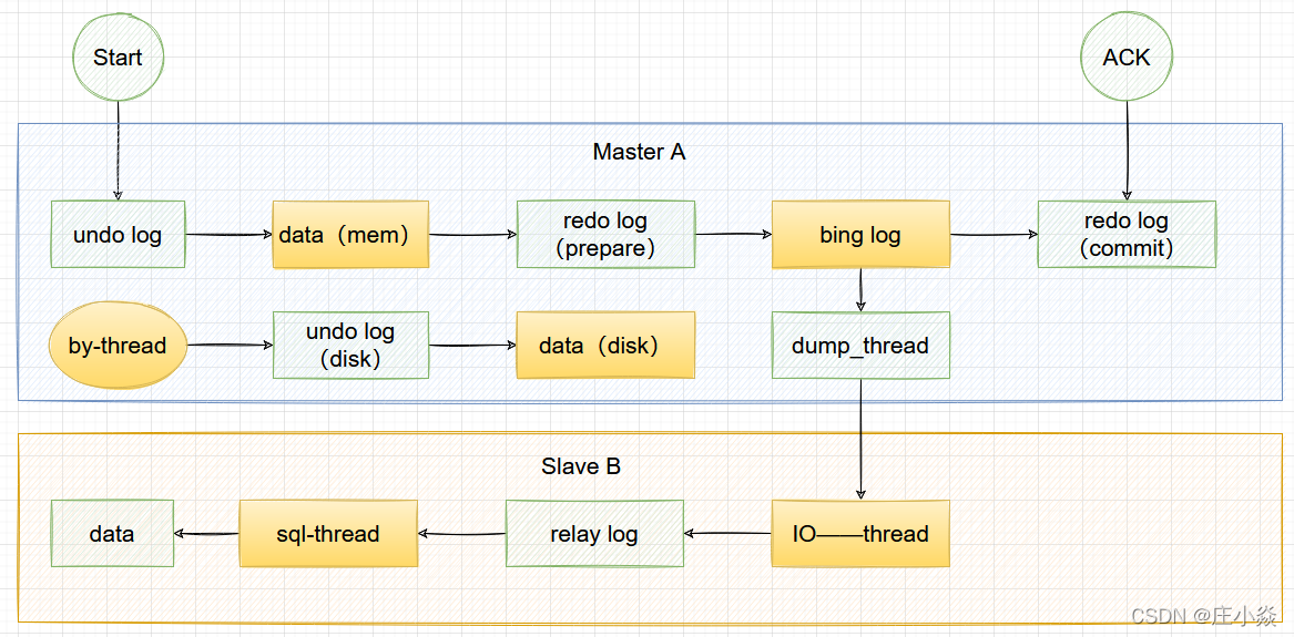 - 在备库 B 上执行 start slave 命令,这时候备库会启动两个线程,就是图中的 io_thread 和 sql_thread。其中 io_thread 负责与主库建立连接。