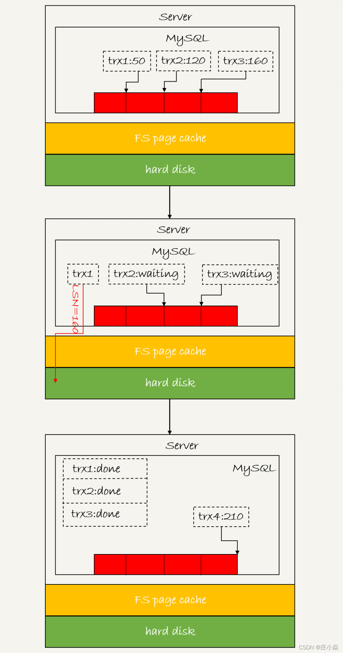 - 等 trx1 要开始写盘的时候,这个组里面已经有了三个事务,这时候 LSN 也变成了 160;