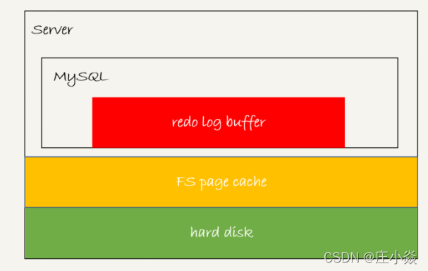InnoDB 有一个后台线程,每隔 1 秒,就会把 redo log buffer 中的日志,调用 write 写到文件系统的 page cache,然后调用 fsync 持久化到磁盘。
