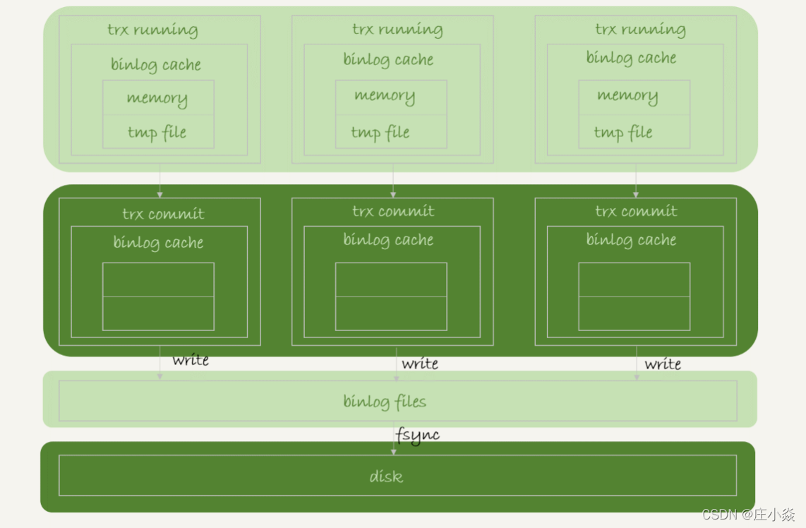 可以看到,每个线程有自己 binlog cache,但是共用同一份 binlog 文件。