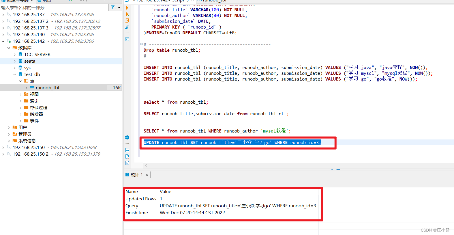 UPDATE runoob_tbl SET runoob_title='庄小焱 学习go' WHERE runoob_id=3;