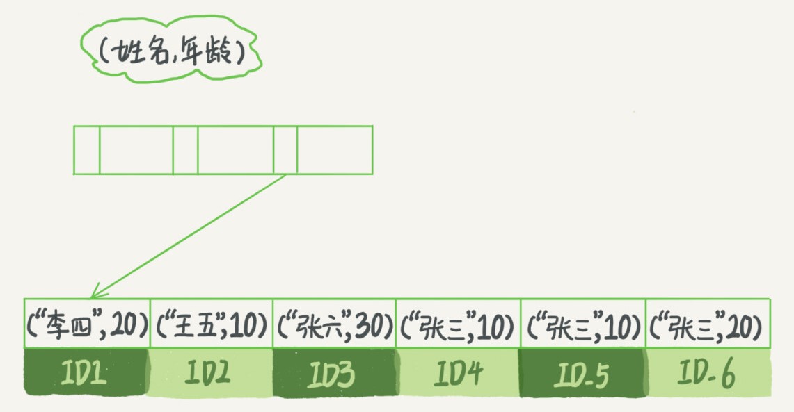 可以看到,索引项是按照索引定义里面出现的字段顺序排序的。当你的逻辑需求是查到所有名字是“张三”的人时,可以快速定位到 ID4,然后向后遍历得到所有需要的结果。如果你要查的是所有名字第一个字是“张”的人,你的 SQL 语句的条件是"where name like ‘张 %’"。这时,你也能够用上这个索引,查找到第一个符合条件的记录是 ID3,然后向后遍历,直到不满足条件为止。可以看到,不只是索引的全部定义,只要满足最左前缀,就可以利用索引来加速检索。这个最左前缀可以是联合索引的最左 N 个字段,也可以是字符串索引的最左 M 个字符。
