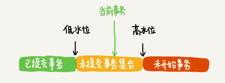 当然,如果“上一个版本”也不可见,那就得继续往前找。还有,如果是这个事务自己更新的数据,它自己还是要认的。在实现上, InnoDB 为每个事务构造了一个数组,用来保存这个事务启动瞬间,当前正在“活跃”的所有事务 ID。“活跃”指的就是,启动了但还没提交。数组里面事务 ID 的最小值记为低水位,当前系统里面已经创建过的事务 ID 的最大值加 1 记为高水位。这个视图数组和高水位,就组成了当前事务的一致性视图(read-view)。而数据版本的可见性规则,就是基于数据的 row trx_id 和这个一致性视图的对比结果得到的。这个视图数组把所有的 row trx_id 分成了几种不同的情况。