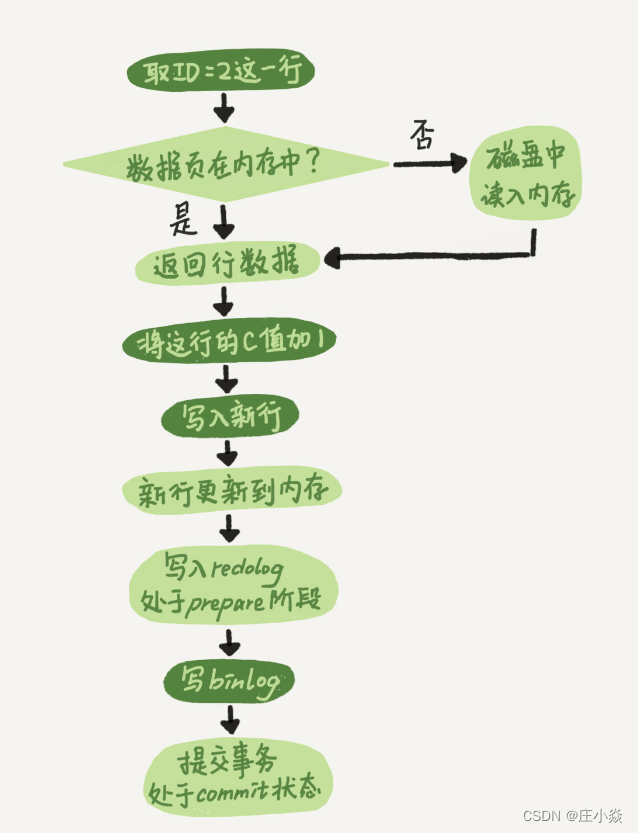 - 引擎将这行新数据更新到内存中,同时将这个更新操作记录到 redo log 里面,此时 redo log 处于 prepare 状态。然后告知执行器执行完成了,随时可以提交事务。