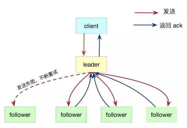 如果 follower 宕机或者运行缓慢或者丢包,leader会不断的重试,直到所有的 follower 最终都复制了所有的日志条目。