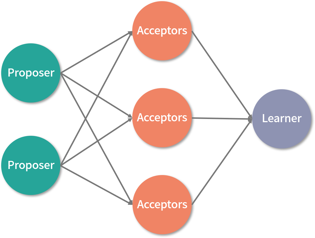 - 决策学习者:不参与决策,从 Proposers/Acceptors 学习最新达成一致的提案(Value)。
