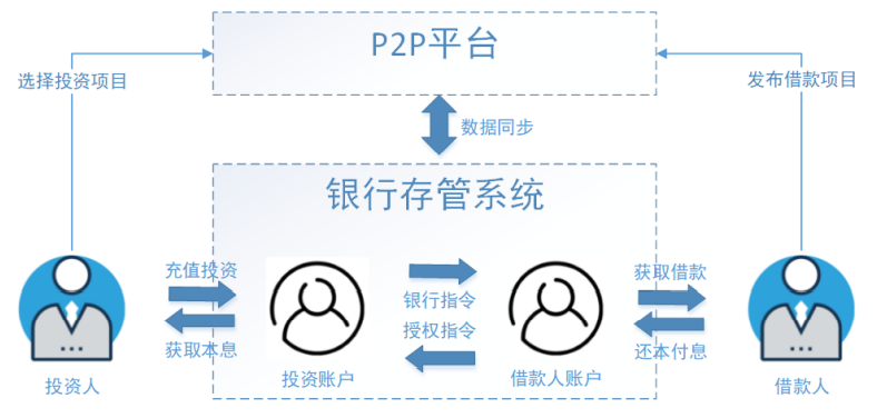 什么是银行存管模式?银行存管模式涉及到2套账户体系,P2P平台和银行各一套账户体系。投资人在P2P平台注册后,会同时跳转到银行再开一个电子账户,2个账户间有一一对应的关系。当投资人投资时,资金进入的是平台在银行为投资人开设的二级账户中,每一笔交易,是由银行在投资人与借款人间的交易划转,P2P平台仅能看到信息的流动。