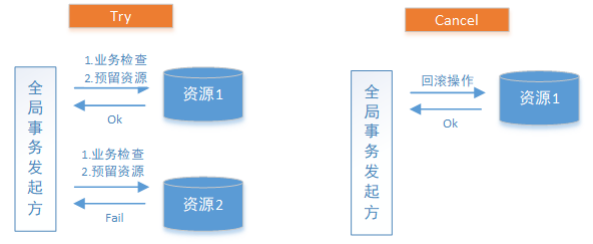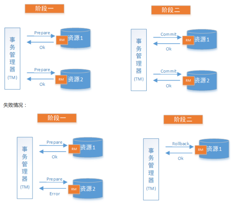 2. 提交阶段(commit phase):如果事务管理器收到了参与者的执行失败或者超时消息时,直接给每个参与者 发送回滚(Rollback)消息;否则,发送提交(Commit)消息;参与者根据事务管理器的指令执行提交或者回滚操 作,并释放事务处理过程中使用的锁资源。注意:必须在最后阶段释放锁资源。 下图展示了2PC的两个阶段,分成功和失败两个情况说明: 成功情况。