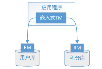 - 2、应用程序(AP)通过TM通知用户库RM新增用户,同时通知积分库RM为该用户新增积分,RM此时并未提交事 务,此时用户和积分资源锁定。