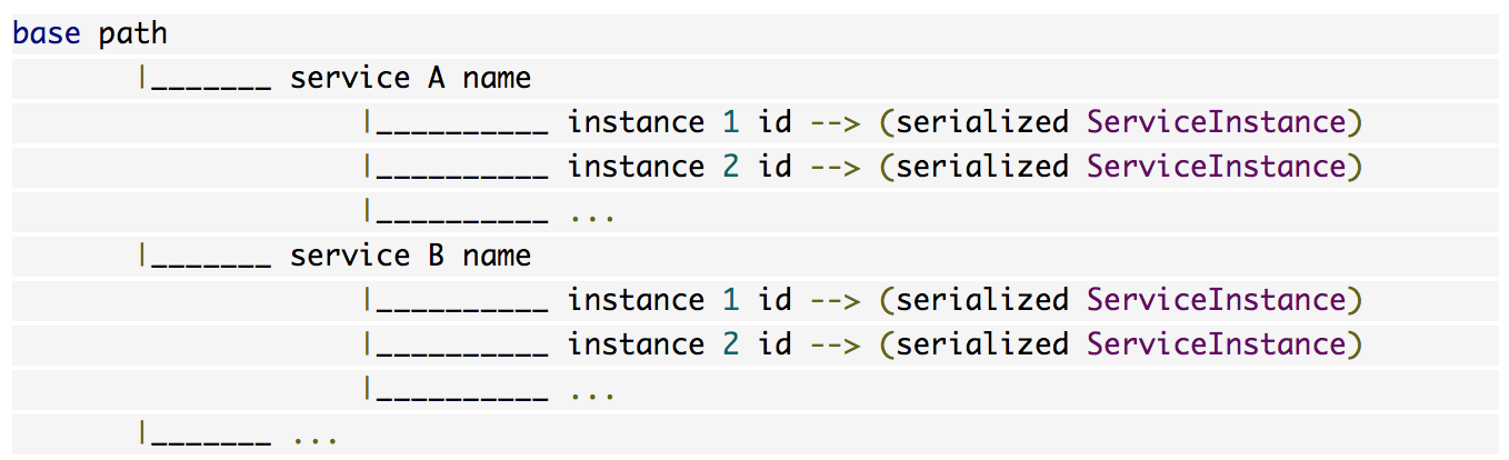 - ServiceInstance。 这是 curator-x-discovery 扩展包对服务实例的抽象,由 name、id、address、port 以及一个可选的 payload 属性构成。其存储在 ZooKeeper 中的方式如下图展示的这样。