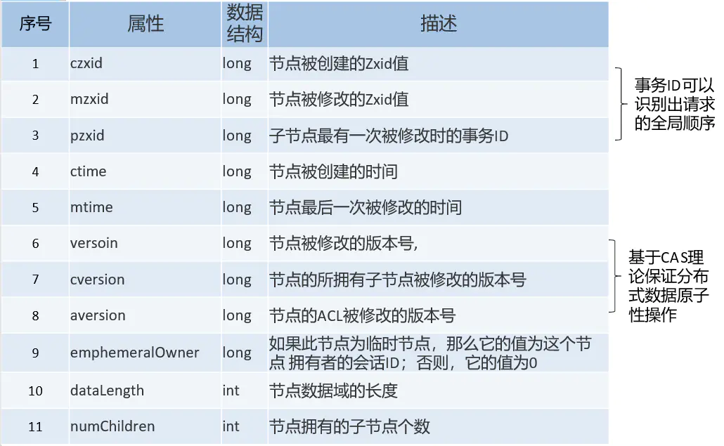 在每个 ZNode 中都维护着一个 stat 结构,记录了该 ZNode 的元数据,其中包括版本号、操作控制列表(ACL)、时间戳和数据长度等信息,如下表所示: