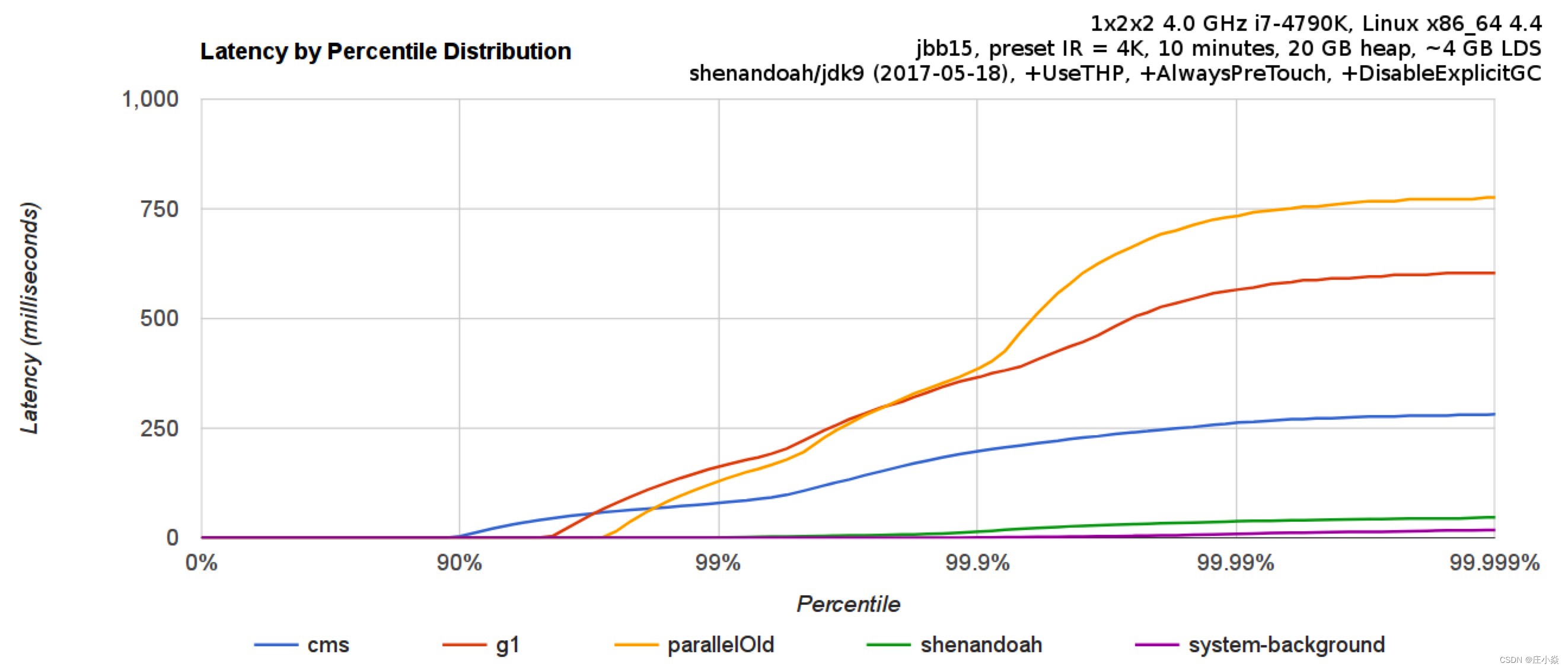 可以看到,相对于 CMS、G1、Parallel GC,Shenandoah 在系统负载增加的情况下,延迟时间稳定在非常低的水平,而其他几种 GC 都会迅速上升。