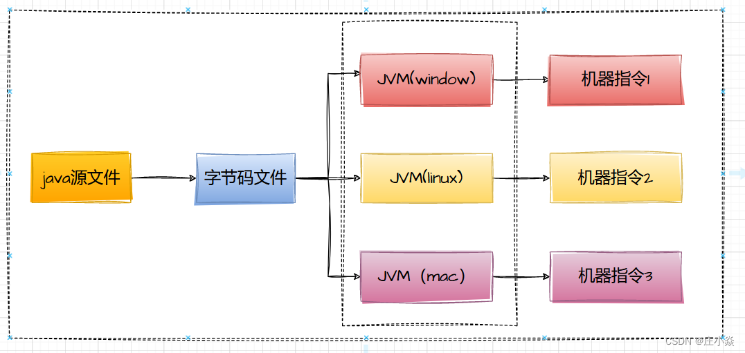 当 Java 虚拟机启动时会根据预定义的规范对字节码采用逐行解释的方式执行,将每条字节码文件中的内容“翻译”为对应平台的本地机器指令执行。JVM设计者们的初衷仅仅只是单纯地为了满足 Java 程序实现跨平台特性,因此避免采用静态编译的方式直接生成本地机器指令,从而诞生了实现解释器在运行时采用逐行解释字节码执行程序的想法。