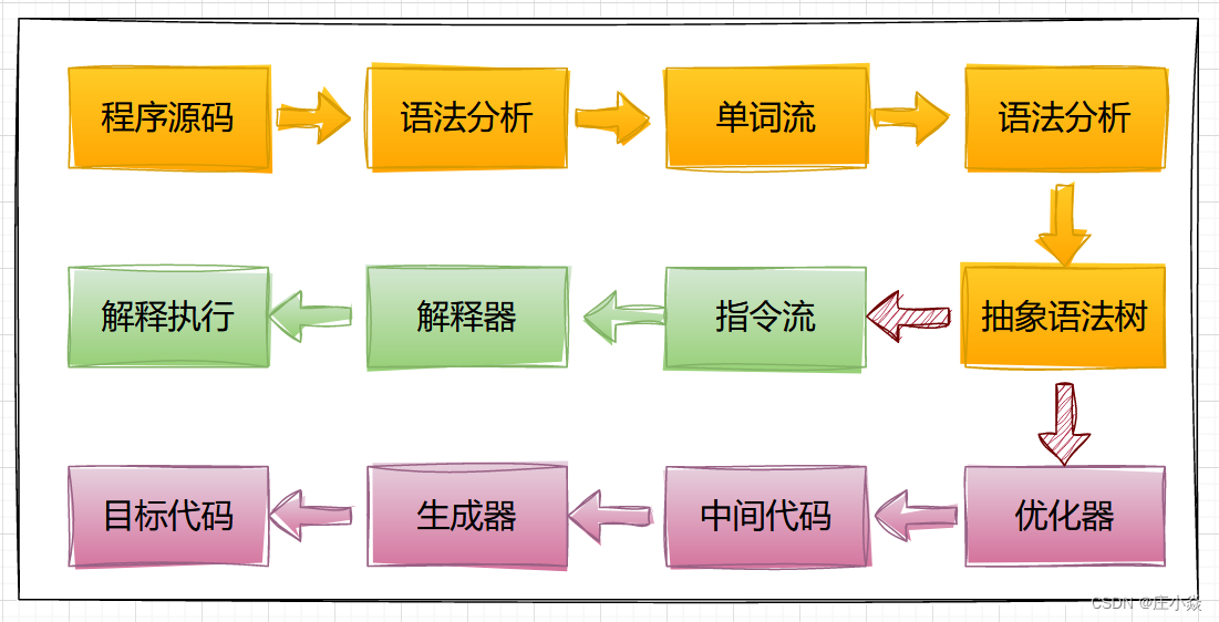 大部分的程序代码转换成物理机的目标代码或虚拟机能执行的指令集之前,都需要经过下图中的各个步骤: