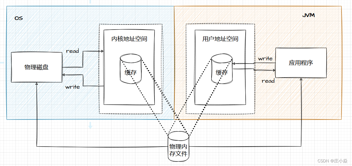 非直接缓存区:使用 IO 读写文件,需要与磁盘交互,需要由用户态切换到内核态。在内核态时,需要两份内存存储重复数据,效率低。