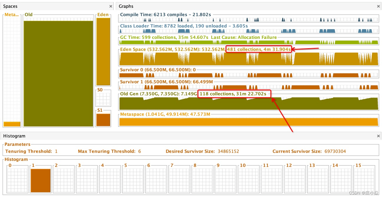 从其中的 OldGen 部分可以看到,118 次 Full GC 消耗了 31 分钟,平均每次达到 20 秒,按图像比例可粗略得知,吞吐率不足 30%。