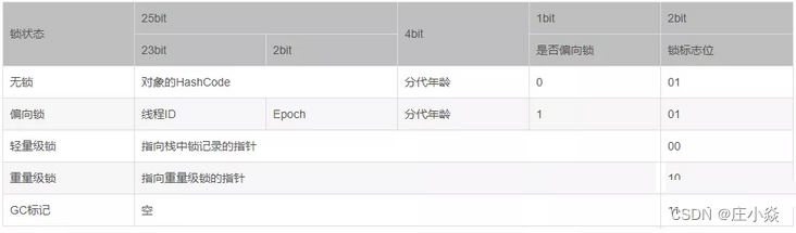 - 偏向锁标识 biased_lock=0且锁标识=01表示无锁状态