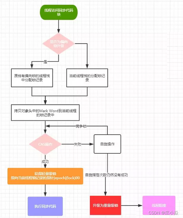 偏向锁的获取: 偏向锁的获取过程非常简单,当一个线程访问同步块获取锁时,会在对象头和栈帧中的锁记录里存储偏向锁的线程ID,表示哪个线程获得了偏向锁,结合前面分析的Mark Word来分析一下偏向锁的获取逻辑