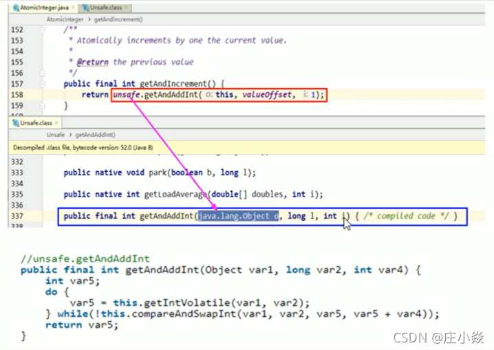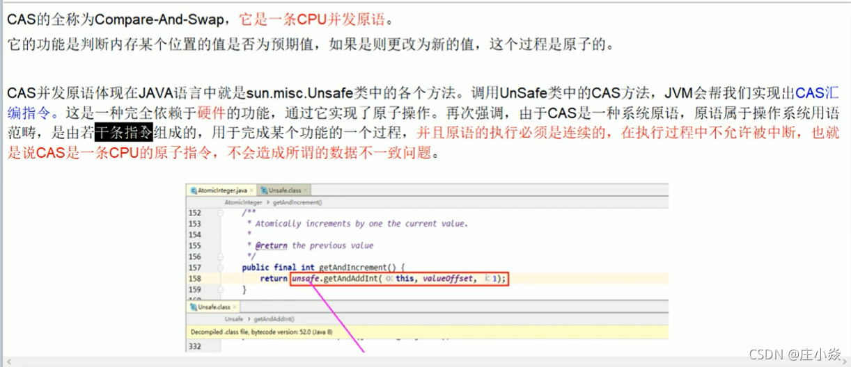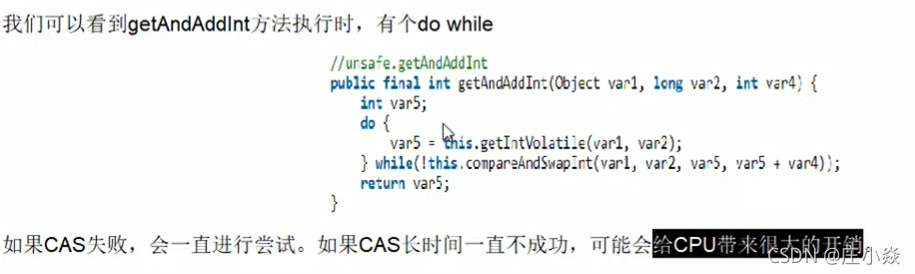 核心思想是unsafe类+CAS自旋锁的实现来保证CPU源语来保证原子性。