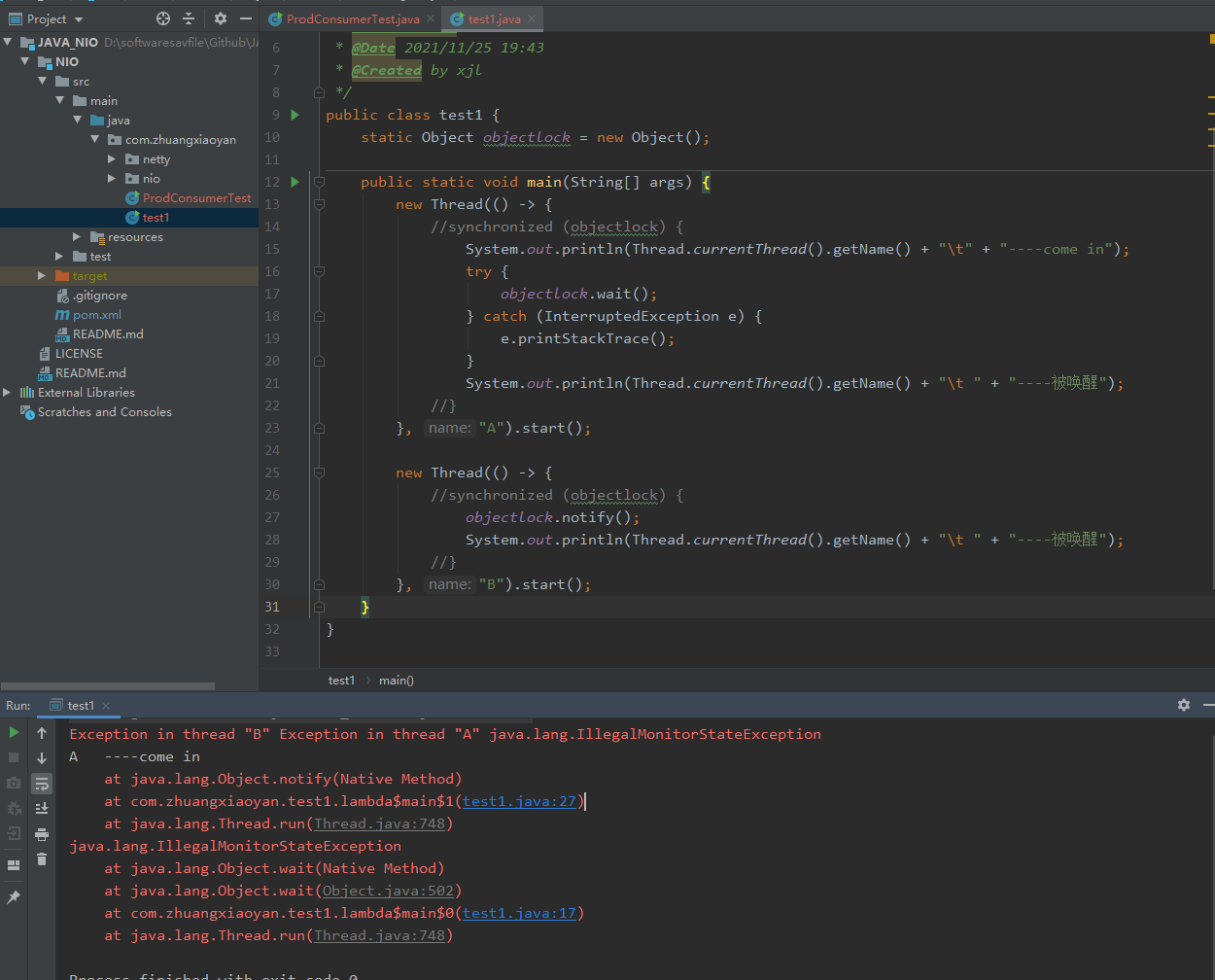 0bject类中的wait、notify、notifyALL用于线程等待和唤醒的方法,都必须在synchronized内部执行必须用到关键字synchronized。先wait后notify才不会报错。