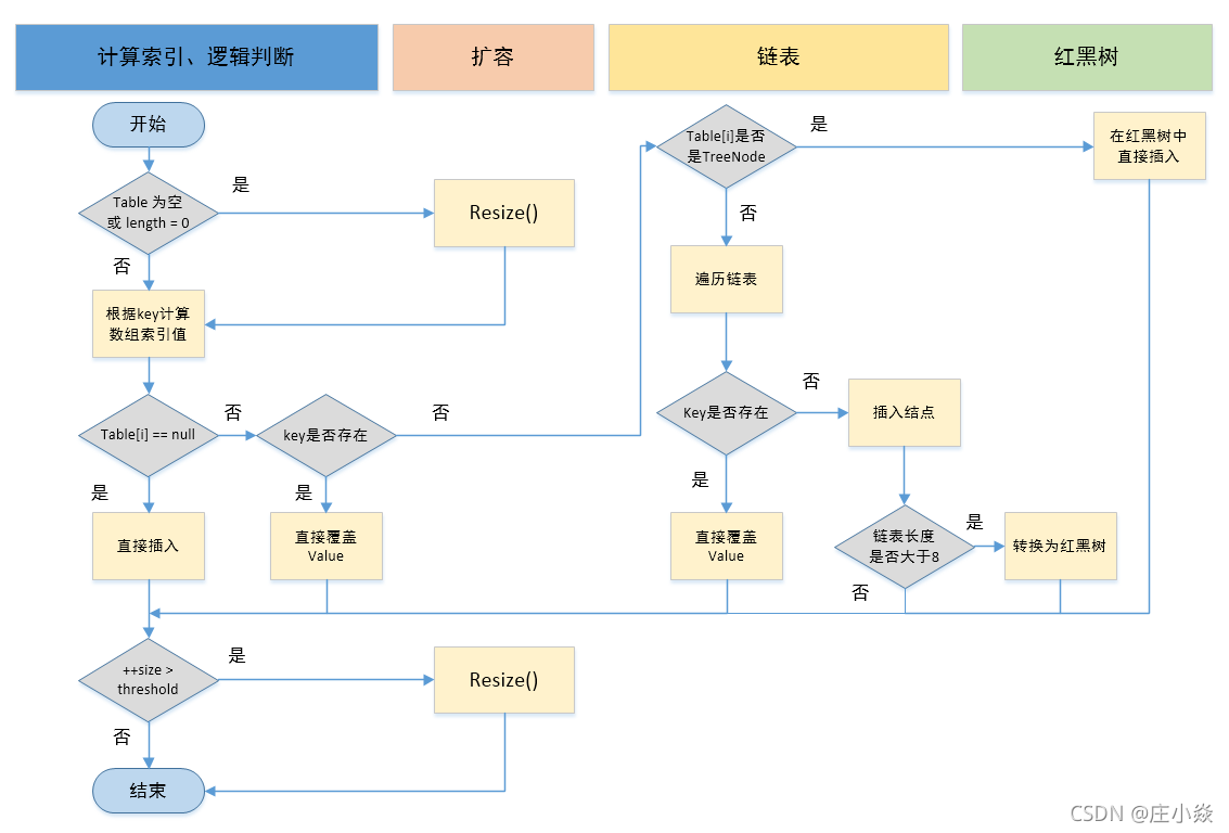 - 遍历table[i],判断链表长度是否大于8,大于8的话把链表转换为红黑树,在红黑树中执行插入操作,否则进行链表的插入操作;遍历过程中若发现key已经存在直接覆盖value即可;