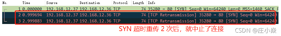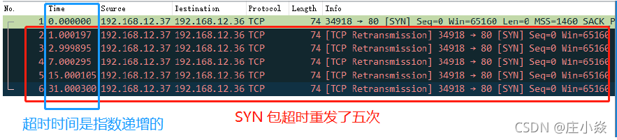 从上图可以发现, 客户端发起了 SYN 包后,一直没有收到服务端的 ACK ,所以一直超时重传了次,并且每次 RTO 超时时间是不同的:
