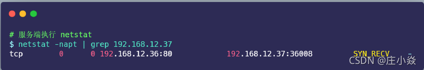 此时,由于服务端收不到第三次握手的 ACK 包,所以一直处于 SYN_RECV 状态: