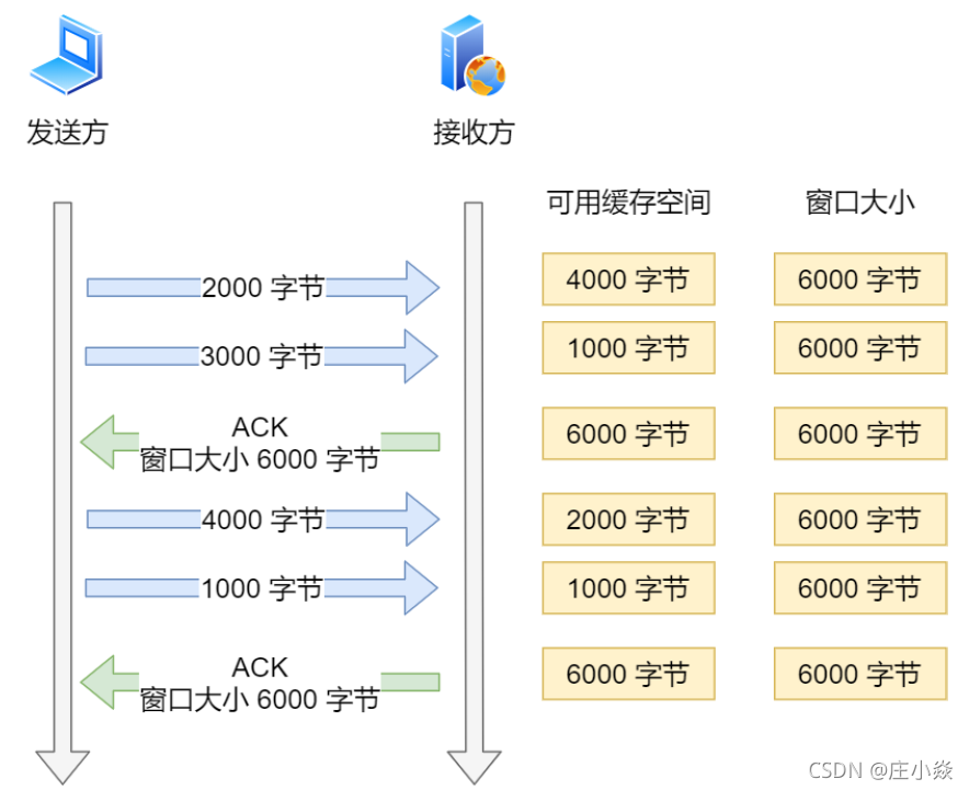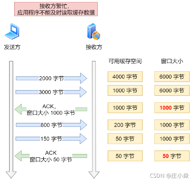 但是现实中服务器会出现繁忙的情况,当应用程序读取速度慢,那么缓存空间会慢慢被占满,于是为了保证发送方发送的数据不会超过缓冲区大小,服务器则会调整窗口大小的值,接着通过 ACK 报文通知给对方,告知现在的接收窗口大小,从而控制发送方发送的数据大小。