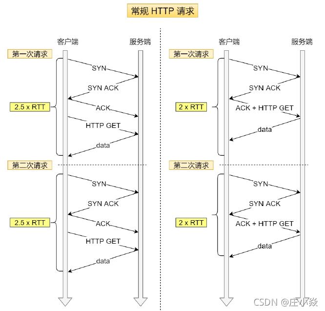 客户端在向服务端发起 HTTP GET 请求时,一个完整的交互过程,需要 2.5 个 RTT 的时延。由于第三次握手是可以携带数据的,这时如果在第三次握手发起 HTTP GET 请求,需要2个RTT的时延。但是在下一次(不是同个 TCP 连接的下一次)发起 HTTP GET 请求时,经历的 RTT 也是一样,如下图: