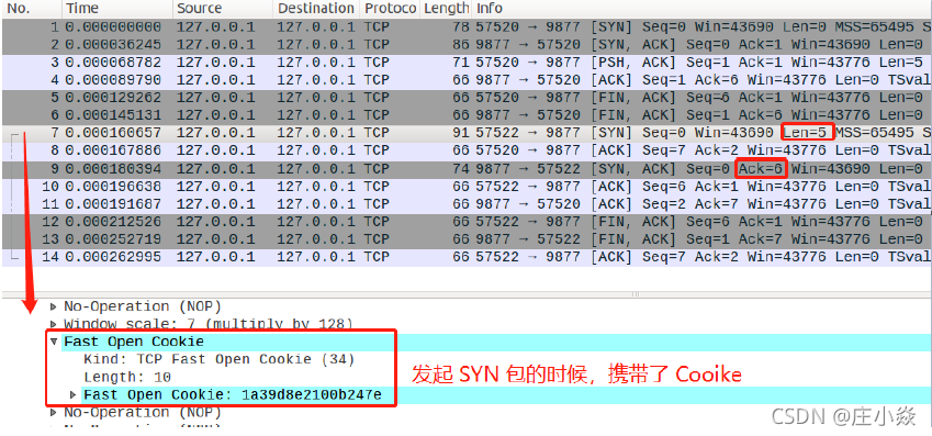 在下图,数据包 7 号,客户端发起了第二次 TCP 连接时,SYN 包会携带 Cooike,并且长度为 5 的数据。服务端收到后,校验 Cooike 合法,于是就回了 SYN、ACK 包,并且确认应答收到了客户端的数据包,ACK = 5 + 1 = 6。