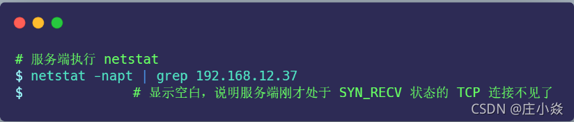 - 接着,服务端超时重传了 SYN、ACK 包,重传了 5 次后,也就是超过 tcp_synack_retries 的值(默认值是 5),然后就没有继续重传了,此时服务端的 TCP 连接主动中止了,所以刚才处于SYN_RECV 状态的 TCP 连接断开了,而客户端依然处于ESTABLISHED 状态;