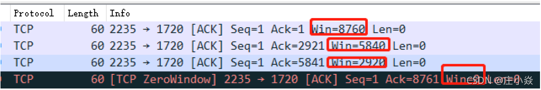 假设接收方处理数据的速度跟不上接收数据的速度,缓存就会被占满,从而导致接收窗口为 0,当发送方接收到零窗口通知时,就会停止发送数据。如下图,可以看到接收方的窗口大小在不断的收缩至 0:接着,发送方会定时发送窗口大小探测报文,以便及时知道接收方窗口大小的变化。