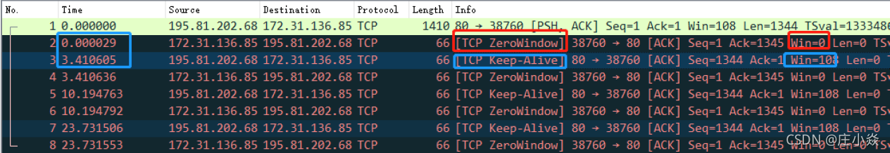 可以发现,这些窗口探测报文以 3.4s、6.5s、13.5s 的间隔出现,说明超时时间会翻倍递增。