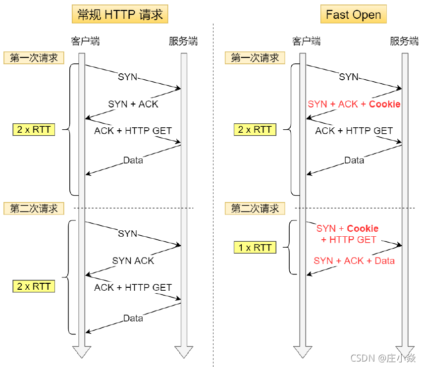 注:客户端在请求并存储了Fast Open Cookie 之后,可以不断重复 TCP Fast Open 直至服务器认为Cookie 无效(通常为过期)。