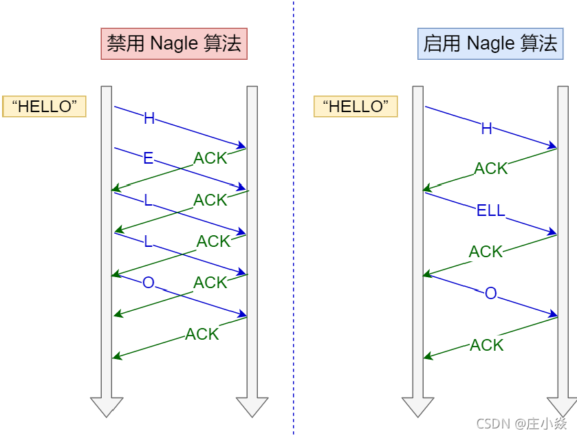 - 而发送方由于 Nagle 算法机制,在未收到第一个报文的确认前,是不会发送后续的数据;