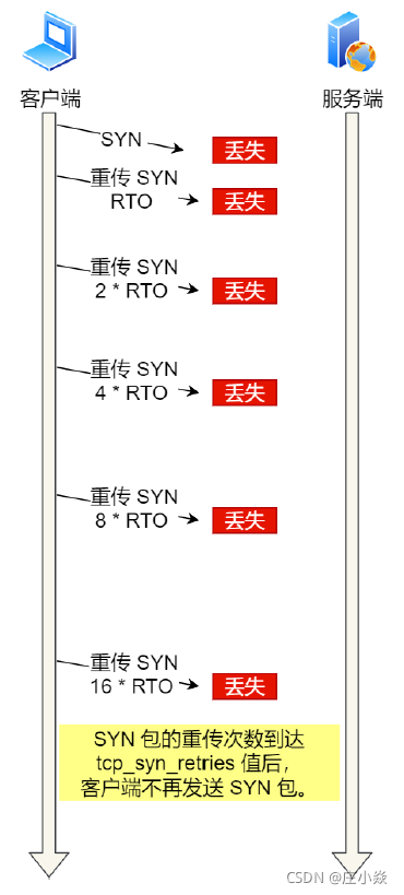 - 最后,客户端 SYN 超时重传次数达到了 5 次(tcp_syn_retries 默认值 5 次),就不再继续发送SYN 包了。