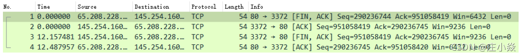 为什么抓到的TCP挥手是三次,而不是书上说的四次?因为服务器端收到客户端的 FIN 后,服务器端同时也要关闭连接,这样就可以把 ACK 和 FIN 合并到一起发送,节省了一个包,变成了“三次挥手”。而通常情况下,服务器端收到客户端的 FIN 后,很可能还没发送完数据,所以就会先回复客户端一个ACK 包,稍等一会儿,完成所有数据包的发送后,才会发送 FIN 包,这也就是四次挥手了。如下图,就是四次挥手的过程: