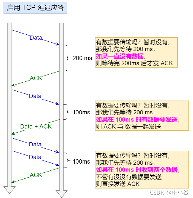 事实上当没有携带数据的 ACK,它的网络效率也是很低的,因为它也有 40 个字节的 IP 头 和 TCP 头,但却没有携带数据报文。为了解决 ACK 传输效率低问题,所以就衍生出了 TCP 延迟确认。