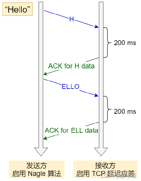 - 所以接收方只能等待最大时间 200 ms 后,才回 ACK 报文,发送方收到第一个报文的确认报文后,也才可以发送后续的数据。
