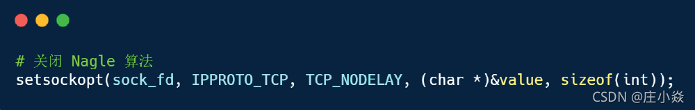 可以看出,Nagle 算法一定会有一个小报文,也就是在最开始的时候。另外,Nagle 算法默认是打开的,如果对于一些需要小数据包交互的场景的程序,比如,telnet 或 ssh这样的交互性比较强的程序,则需要关闭 Nagle 算法。可以在 Socket 设置 TCP_NODELAY 选项来关闭这个算法(关闭 Nagle 算法没有全局参数,需要根据每个应用自己的特点来关闭)。