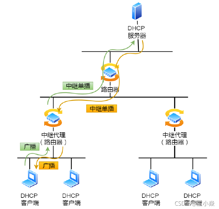 DHCP 客户端会向 DHCP 中继代理发送 DHCP 请求包,而 DHCP 中继代理在收到这个广播包以 后,再以单播的形式发给 DHCP 服务器。服务器端收到该包以后再向 DHCP 中继代理返回应答,并由 DHCP 中继代理将此包广播给DHCP 客户端 。因此,DHCP 服务器即使不在同一个链路上也可以实现统一分配和管理IP地址。