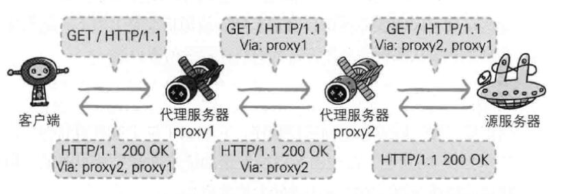 在HTTP通信过程中,可级联多台代理服务器。请求和响应的转发会经过数台类似锁链一样连接起来的代理服务器。转发时,需要附加Via首部字段以标记出经过的主机信息。