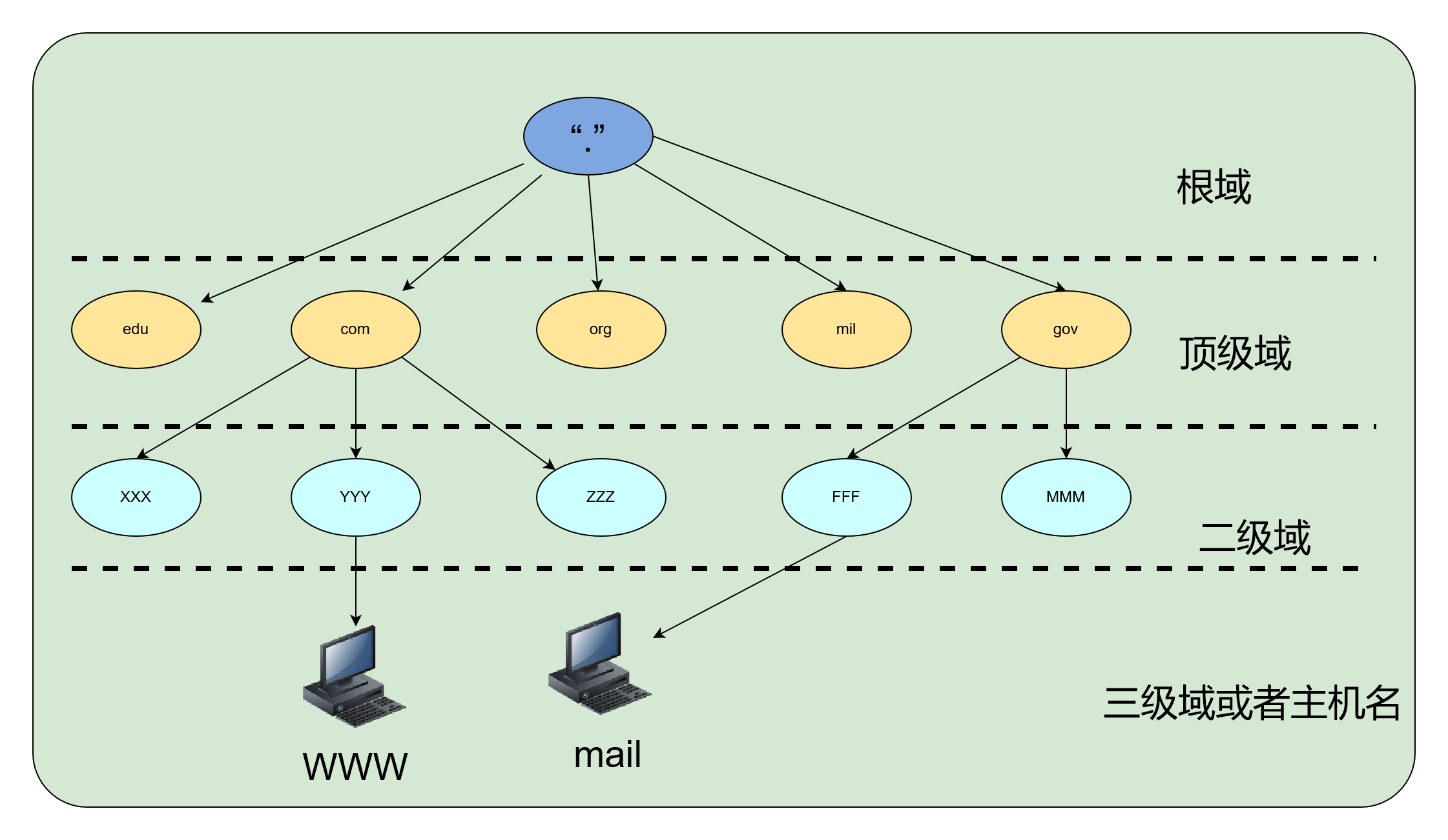 - 根域:DNS域名使用中规定由尾部句点'.'来指定名称位于根或者更高层次的域层次结构。
