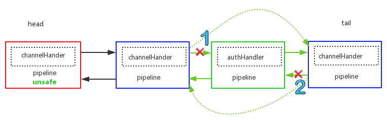 pipeline删除节点netty 有个最大的特性之一就是Handler可插拔,做到动态编织pipeline,比如在首次建立连接的时候,需要通过进行权限认证,在认证通过之后,就可以将此context移除,下次pipeline在传播事件的时候就就不会调用到权限认证处理器。